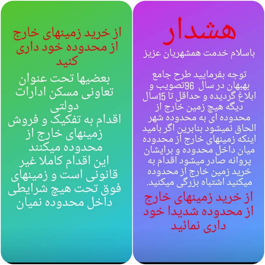 بهادری خطاب به کسانی که اقدام به خرید زمین های خارج از محدوده می کنند نوشت: اگر به این امید که زمین های خارج از محدوده بزودی وارد محدوده شده یا پروانه ساختمانی برایشان صادر می شود اقدام به خرید کرده اید، اشتباه بزرگی می کنید و از خرید زمین خارج محدوده خودداری کنید.