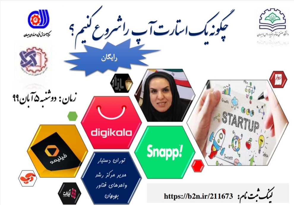 در اولین مرحله، روز دوشنبه ۵ آبان ماه ویبنار استارت آپی توسط سرکار خانم توران دستیار مسول مرکز رشد دانشگاه خاتم الانبیاء ص بهبهان به عنوان مربی با موضوع چگونه یک استارت آپ را شروع نماییم، تفاوت استارت آپ با کسب کارهای سنتی، مراحل ایجاد و رشد یک استارت آپ، ارزش استارت آپ ها برگزار شد.
