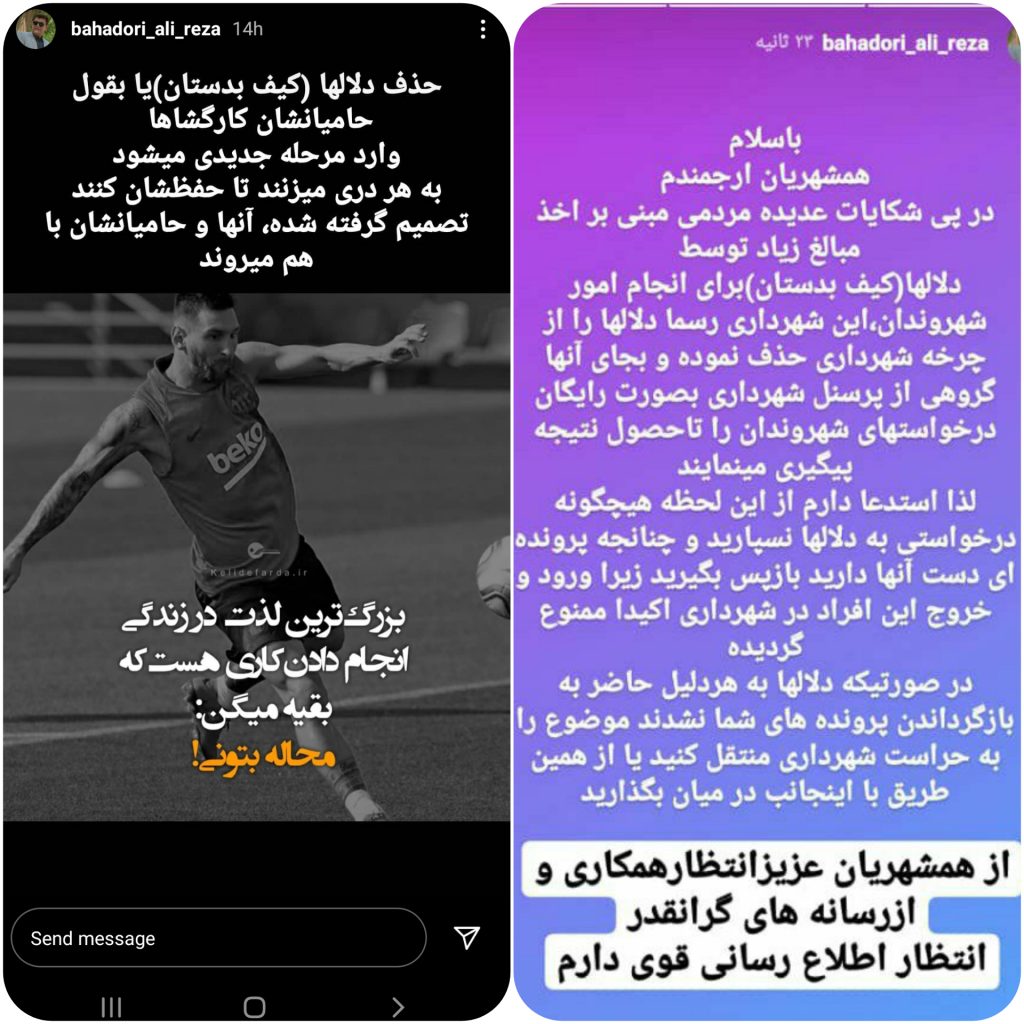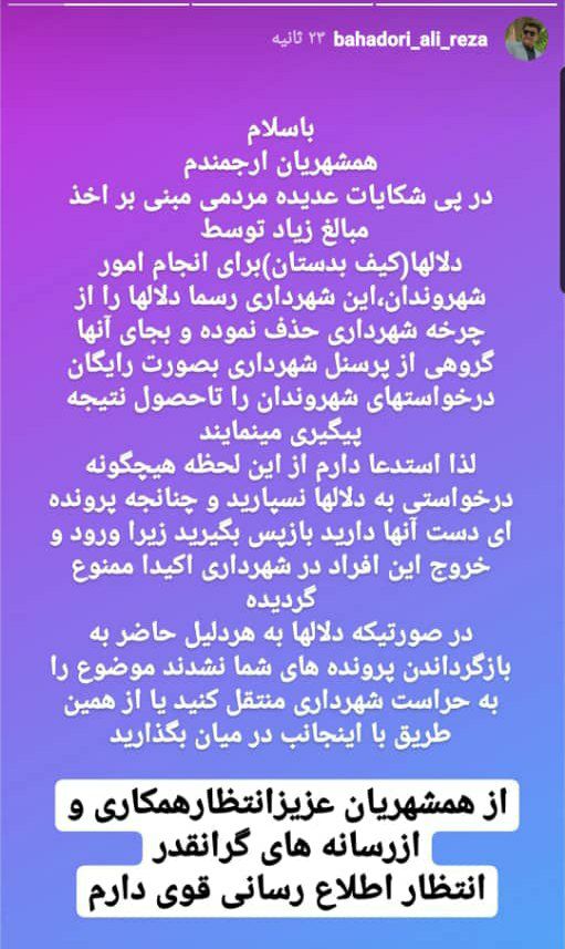 علیرضا بهادری نیز در تازه ترین واکنش خود به این موضوع با انتشار عکس نوشته هایی در صفحه مجازی خود برای این افراد و حامیانشان خط و نشان جدی کشیده و ضمن تاکید دوباره بر حذف کامل واسطه گری در شهرداری، از شهروندان و مراجعین خواسته پرونده های خود را بصورت کاملا رایگان فقط از میز خدمت پیگیری کنند.
