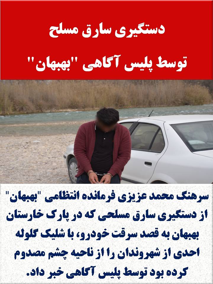فرمانده انتظامی "بهبهان" از دستگیری سارق مسلحی که در پارک خارستان بهبهان به قصد سرقت خودرو اقدام به تیر اندازی کرد خبر داد: