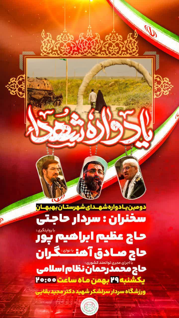 دبیر ستاد یادواره شهدای بهبهان با تقدیر از پیگیری ها و حمایت فرماندار ‌و امام جمعه محترم شهرستان بهبهان در جهت برگزاری یادواره شهدا گفت: برای برگزاری یادواره شهدا همه ی ادارات، دستگاه های اجرایی و صنایع شهرستان دعوت به همکاری شده اند، که خدا روشکر تا کنون اکثر دستگاه ها پای کار بوده اند، ولی متاسفانه برخی از آن ها کم کاری داشته اند که امیدواریم در فرصت باقی مانده نسبت به انجام کارهای محوله اقدام کنند.