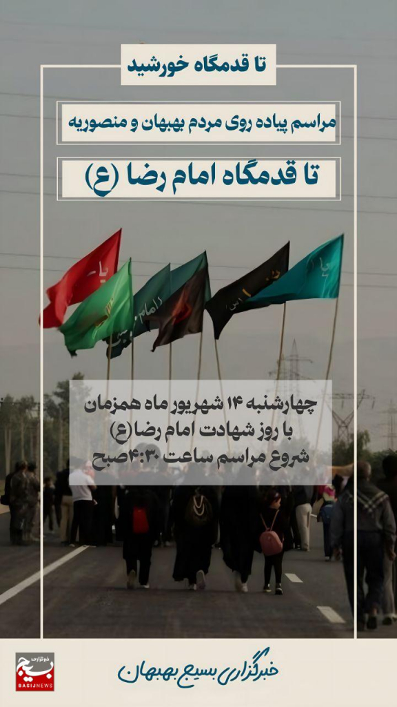 مراسم پیاده روی مردم بهبهان و شهر منصوریه تا قدمگاه امام رضا(ع) روز چهارشنبه ۱۴ شهریور ماه ۱۴۰۳ ساعت پس از نماز صبح آغاز خواهد شد .