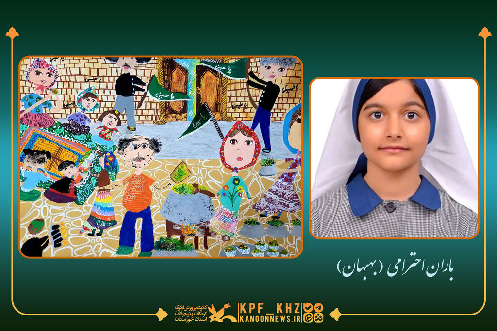 برهمین اساس، باران احترامی ۱۱ ساله از مرکز فرهنگی هنری شماره سه بهبهان با مربیگری ناهید مهران فر با ارسال اثر خود که با مفاهیم؛ دورهمی خانواده در خانه ی مادربزرگ، حضور اقوام و بچه ها ، شب زنده داری برای امام حسین(ع) و پختن آش نذری عاشورا ( شور حسینی در خانواده های ایرانی و توجه به سنت و فرهنگ) تولید شده بود، موفق به دریافت جایزه ویژه این مسابقه بین‌المللی شد.