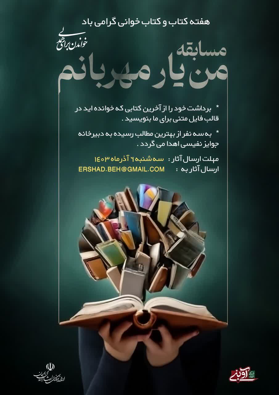 به گزارش بهبهان صدا، همزمان با هفته کتاب و کتابخوانی و در راستای اجرای شعار خواندن برای همدلی مسابقه من یار مهربانم و اولین کتابی که خواندم برگزار می شود.