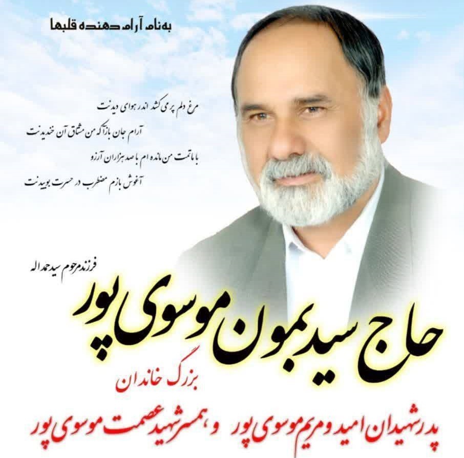 به گزارش بهبهان صدا، حاج سید بمون موسوی پور پدر شهیدان سید امید و سیده مریم موسوی پور و همسر شهیده سیده عصمت موسوی پور پس از سالها تحمل فراق، دارفانی را وداع گفت و به شهیدان پیوست.